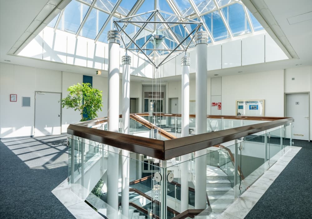 Beim Bau setzte der innovative Konzern auf modernste Technik und höchste Repräsentativität, durch die sich das Haus auch heute ausgesprochen attraktiv präsentiert. Das Highlight ist das großzügige Treppenhaus aus Marmor, in das durch ein Glasdach bis ins Erdgeschoss Tageslicht einfällt.